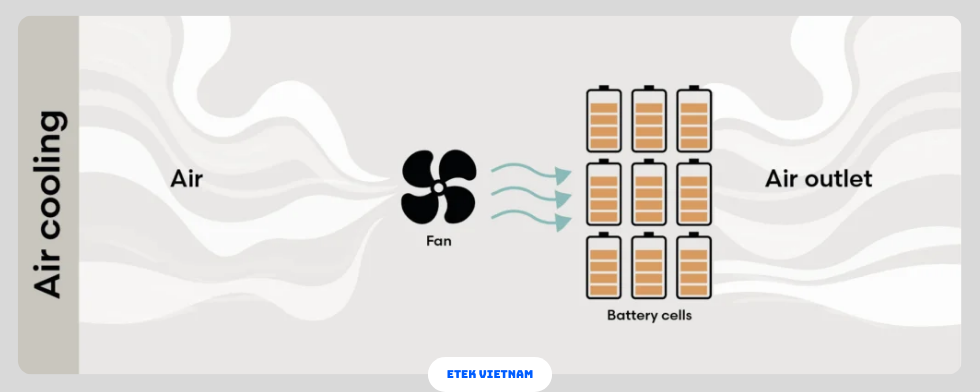 Sử dụng luồng gió tuần hoàn khép kín giúp giảm ô nhiễm bụi, duy trì điều kiện nhiệt độ ổn định. Không khí đi qua dàn lạnh, hấp thụ nhiệt từ pin rồi quay lại module. Khi kết hợp với cảm biến nhiệt độ thông minh, hệ thống tự điều chỉnh lưu lượng, giảm thiểu điện năng phụ trợ cho quạt, đảm bảo COP ≥3.